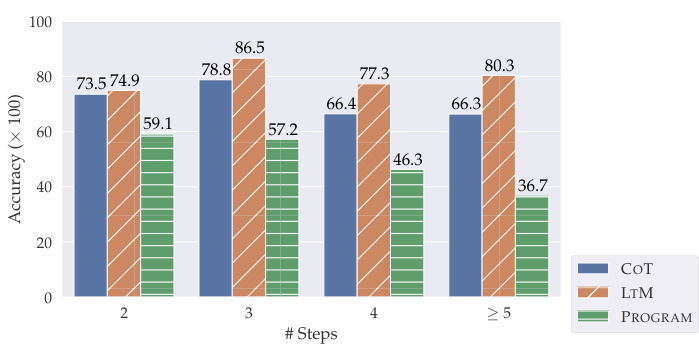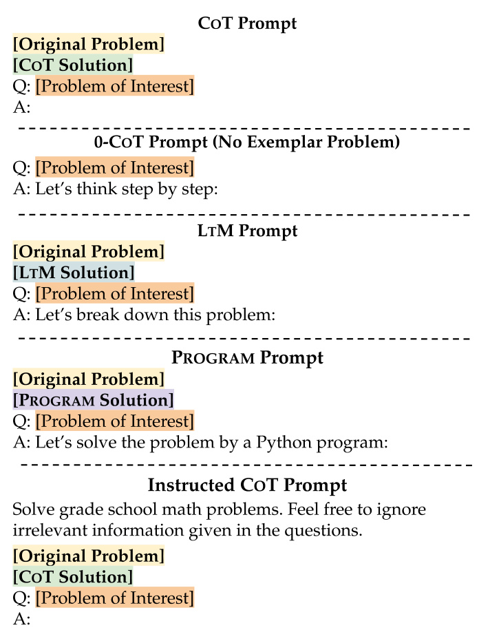 图 2 展示了我们在实验中使用的一些提示示例。对于少样本提示技术(即 COT、LTM 和 PROGRAM),输入提示包含示例问题及其答案,后接待求解的目标问题。为了保持提示设计的简洁性,并避免在提示工程中出现过拟合现象,我们遵循 Zhou et al. (2022) 在示例构建方面的做法;即在主要实验中仅使用一个简单的示例。该示例可以基于**[原始问题]** 或 [带无关上下文的问题] 构建。